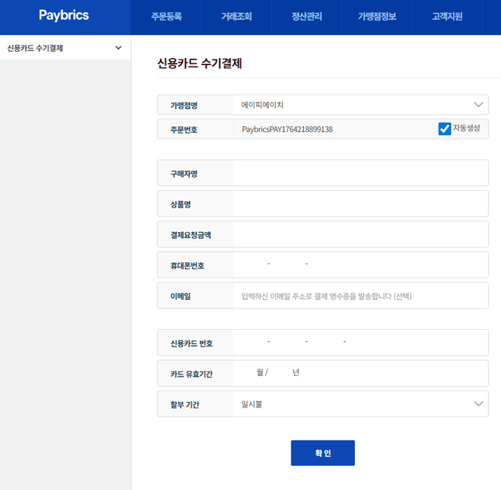 가맹점이 고객으로부터 비대면으로 카드정보를 전달받아 수기로 입력 후 결제하는 방식으로